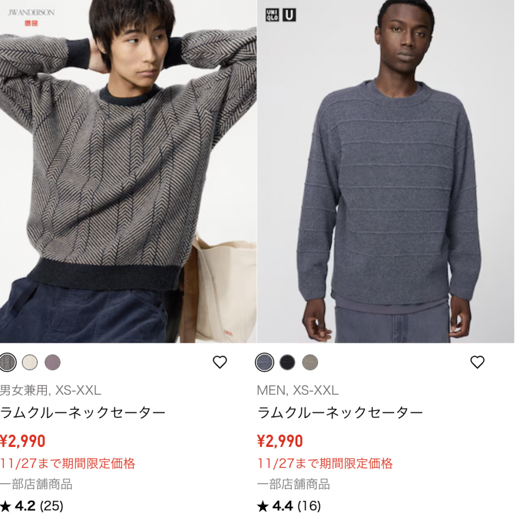 - 2025秋冬:11月3週(感謝祭)U、JWAラムクルーネックセーター(定価4,990円)が通常値下げ(3,990)後期間限定価格の対象に。